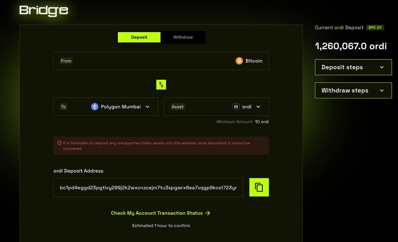 1. We’ll provide you with a unique BRC-20 deposit address. Please access your BTC wallet and select the specific quantity of assets you’d like to transfer cross-chain.