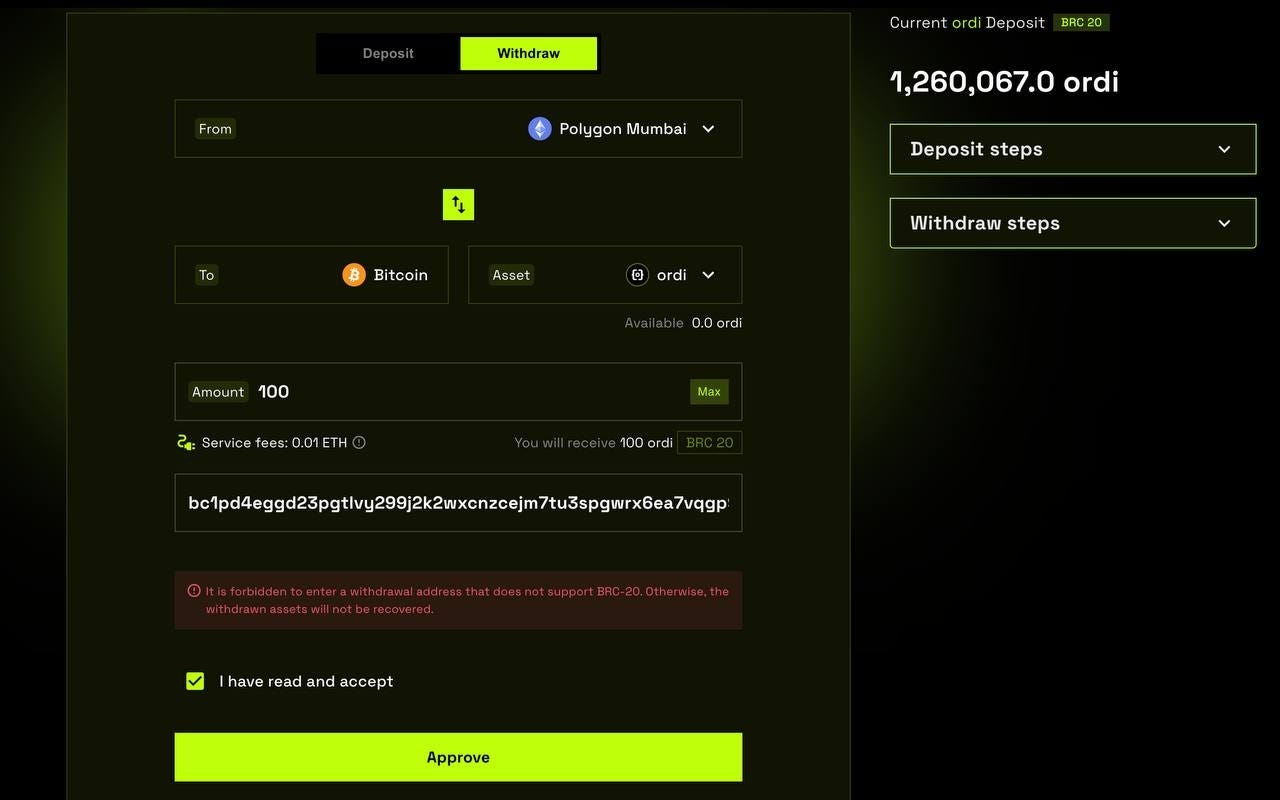 Specify the quantity you wish to withdraw and provide the BRC-20 receiving address where you’d like to receive the BRC20 assets back from EVM networks.